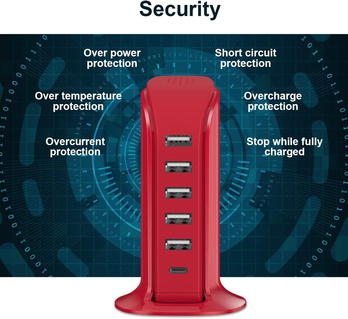 - 6 Charging Ports: Includes 5 USB-A ports (up to 2.4A per port) and 1 USB-C fast charging port for newer devices.